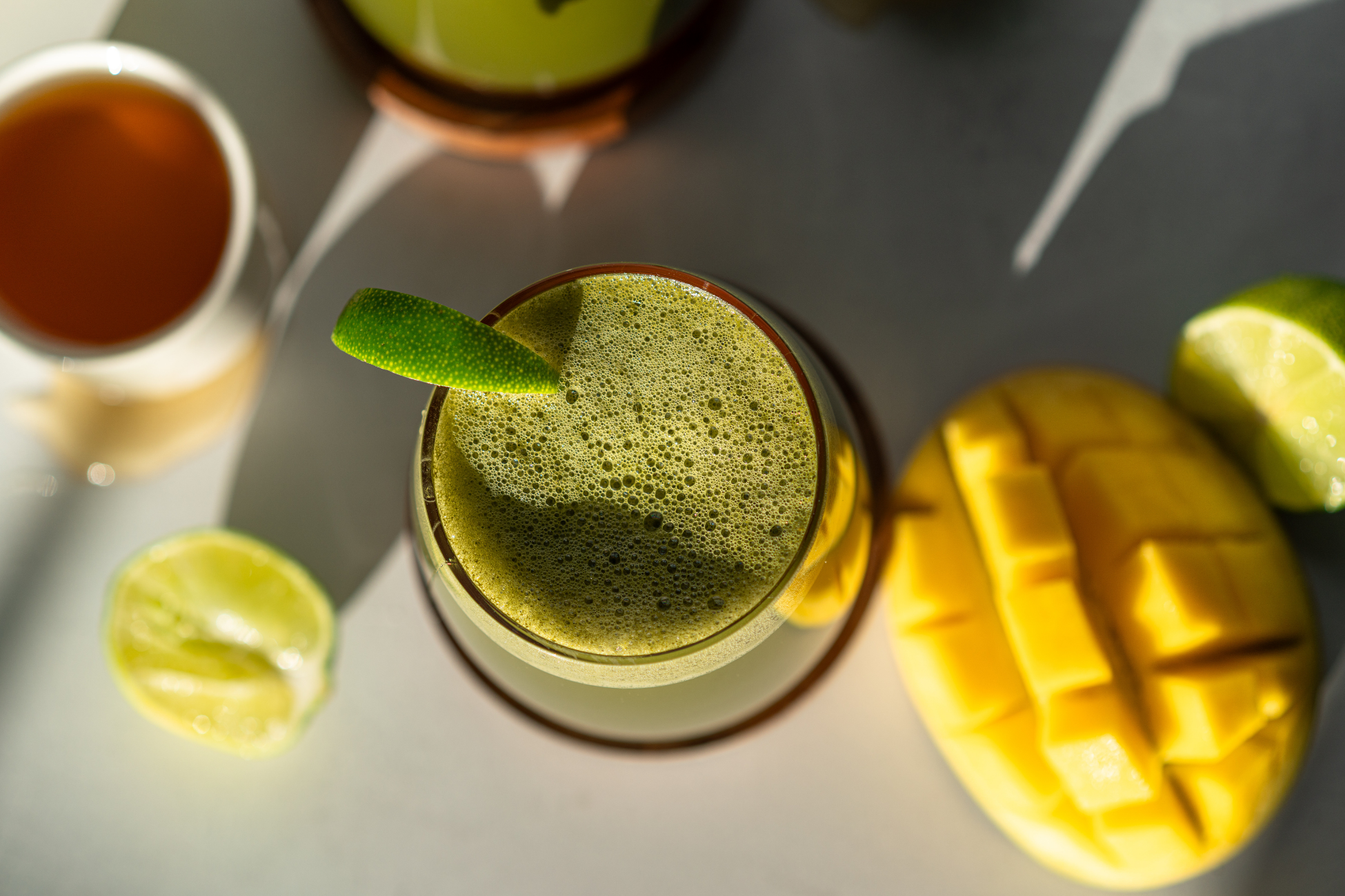 Matcha tea + mango purée + sparkling water + mint sprig — with optional vodka on the side for guests who want it.